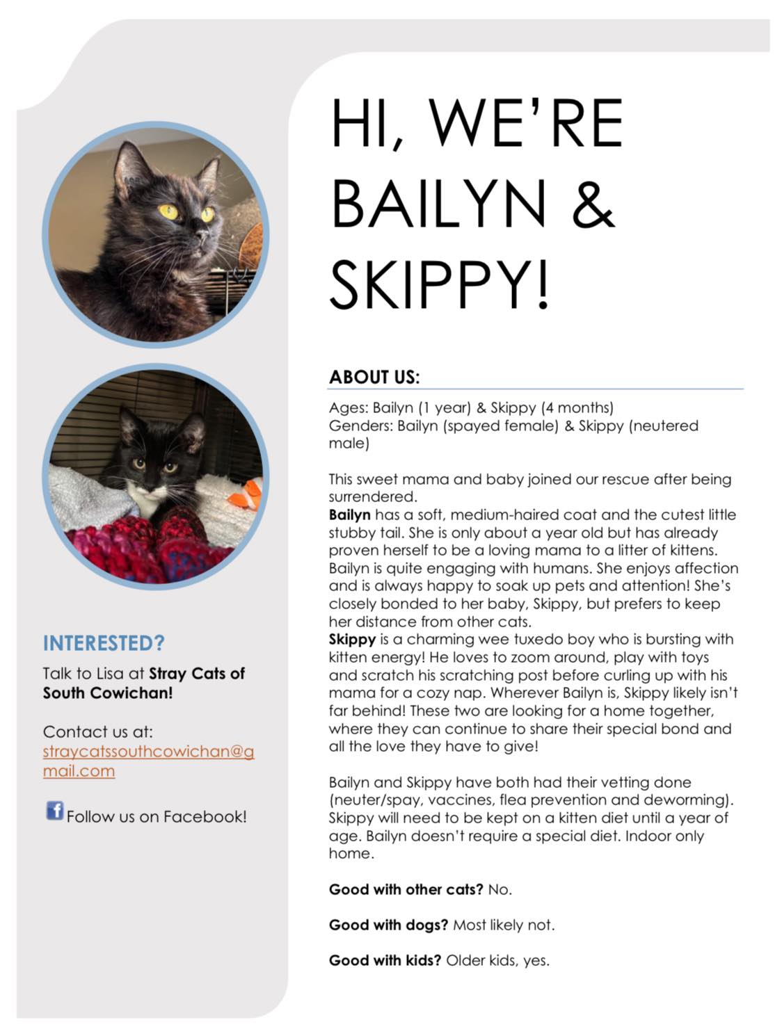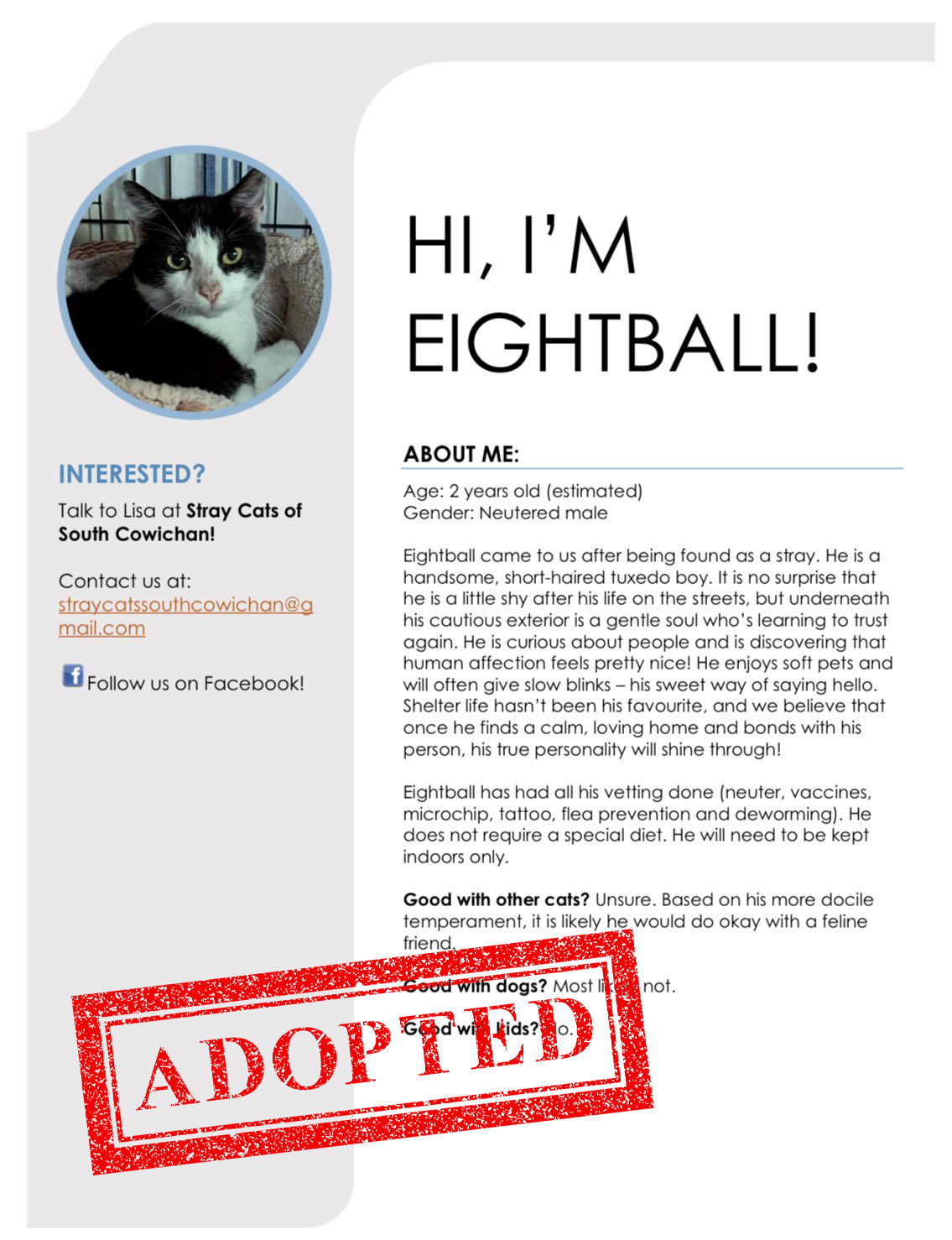 Stray Cats of South Cowichan Rescue Society (SCSCRS), is a nonprofit organization founded by a team of female veterans of the Canadian Forces, our aim is to rescue stray and abandoned cats in the South Cowichan area. We work tirelessly to reduce the population of homeless cats through rescue, rehabilitation, spaying and neutering, and adoption.