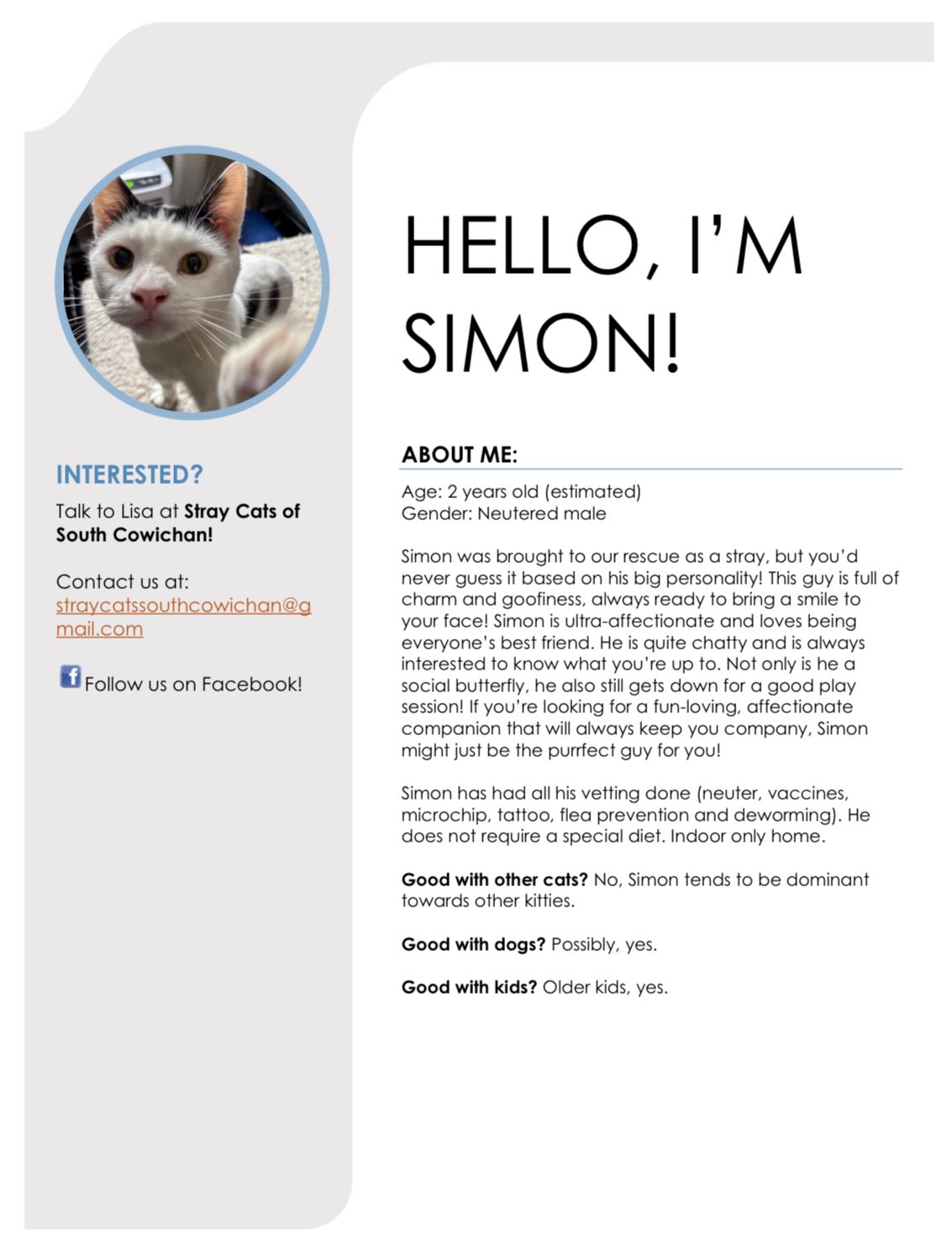 This super, amazing 14 year old senior was found wandering the streets in Shawnigan Lake. We (or our fabulous vets) managed to find his original owner; he was given to a friend when she moved 12 years ago. 2 years ago this person passed away…we are not sure where he has been these past 2 years, but he is VERY skinny. He is eating like a champ and has gained 2lbs since he has come into our care.