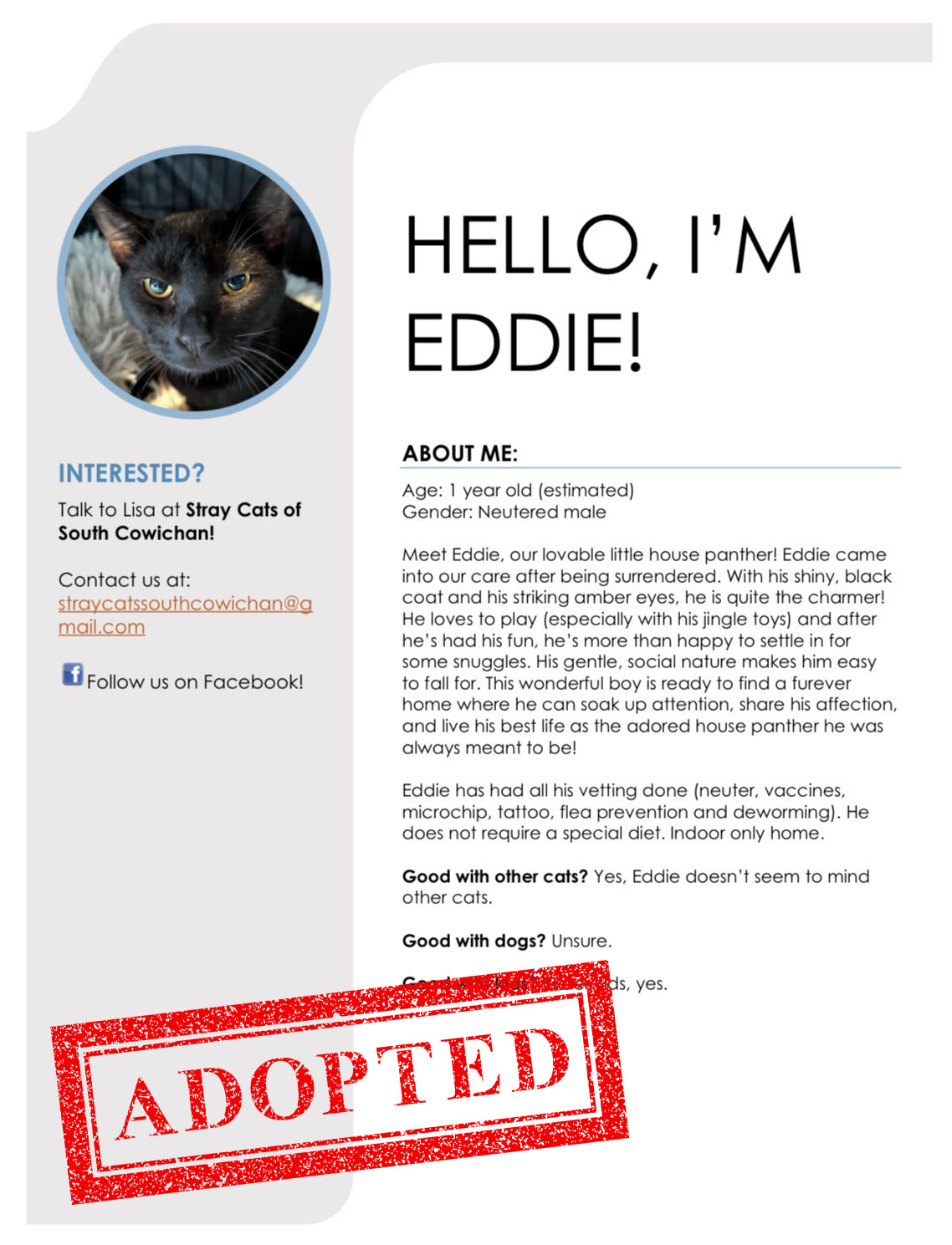 At Stray Cats of South Cowichan, we’ve been privileged to witness some heartwarming transformations thanks to the generosity of our supporters. Our dedicated team ensures every cat receives the medical attention, rehabilitation, and love they need to heal and start anew. With every life we save, we’re reminded that hope begins with compassion and that every rescued cat has a story worth sharing. Check out our Facebook page to follow along and celebrate the cats you’ve made a difference in helping.